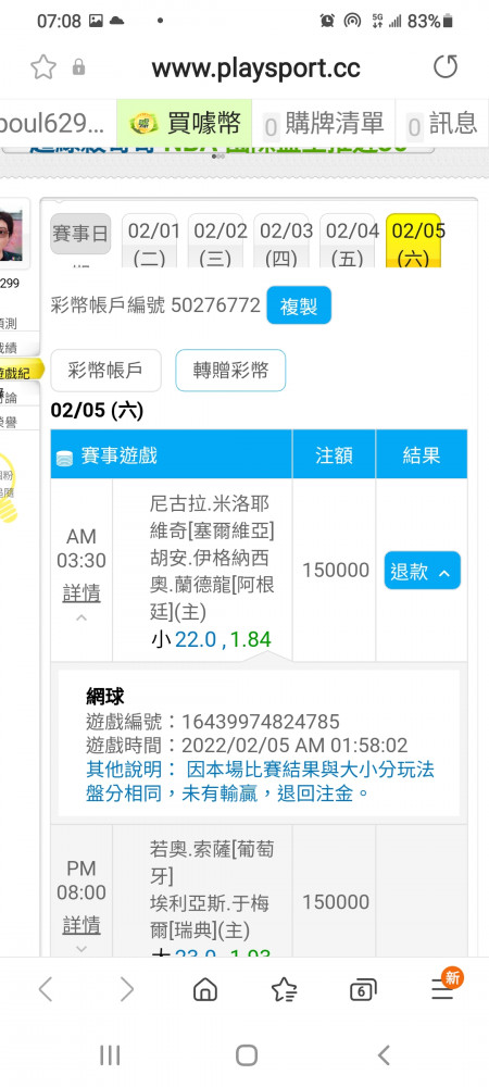 該場賽果總分為22分與大小玩法盤口相同,因此才退回注金喔