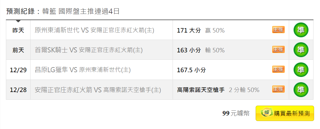 韓國職籃 >> [近5日20過15] 主推也連過4喔!! 快跟上啦