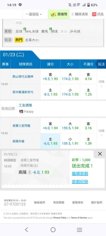 韓國職籃 >> 運彩筆大小連贏3天4過4今天79原本特價邀請朋友們上車一起殺豬頭!