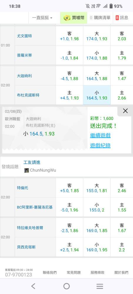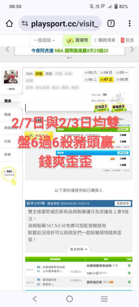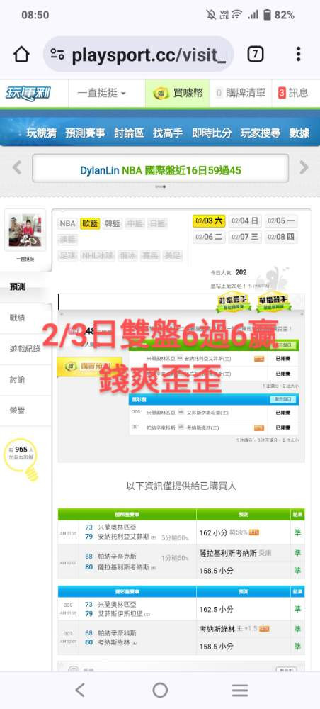 歐洲職籃 >> 國際主推近9日過8盤2/3、2/7均雙盤6過6戰績夯朋友們上車殺豬頭!