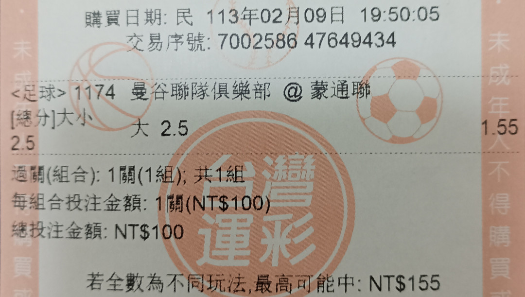 >> 泰甲 單場 總分大於2.5(2/9)