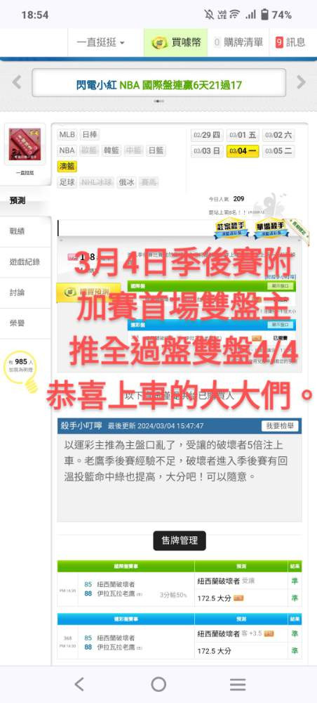 澳洲職籃 >> 澳籃國際連贏二天6過5三月4日雙盤4過4雙殺豬頭領錢爽歪歪朋友們上車吧!