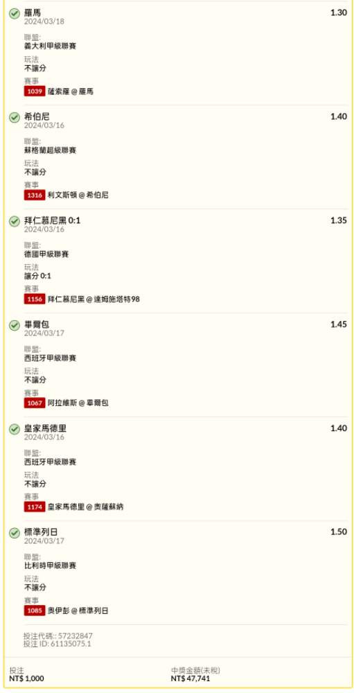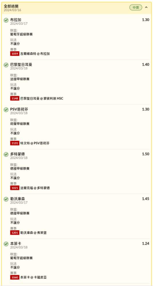 過關炫耀 >> 3/16足球不讓分串關試單12過12中47.7倍