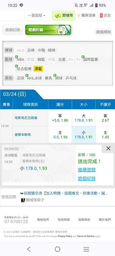 澳洲職籃 >> 決賽第三場關鍵聽牌局上一場精準命中雙盤4/4今天延續氣勢再來一次把握機會!