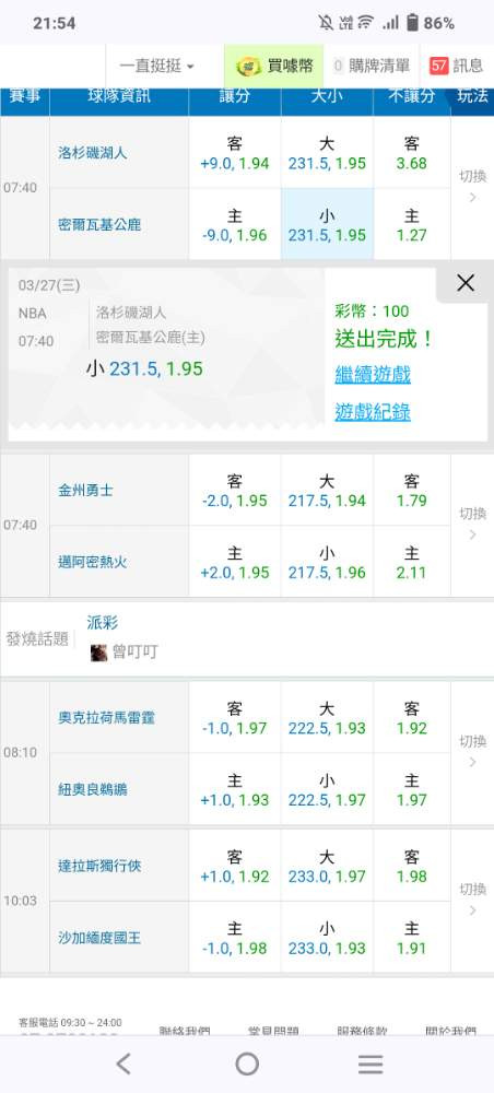 NBA >> 雙盤主推連過2天3/26日雙盤10過8近況夯邀請朋友們繼續上車殺豬領錢吧!