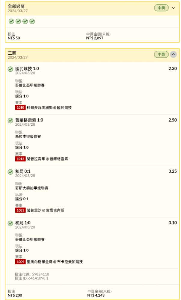 過關炫耀 >> 足球讓分串關4過4中2單57.9倍跟68倍