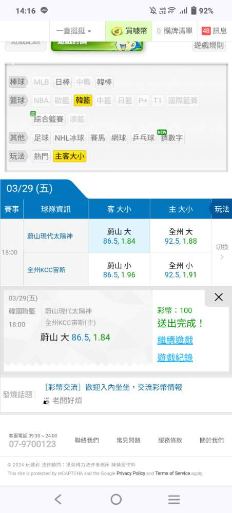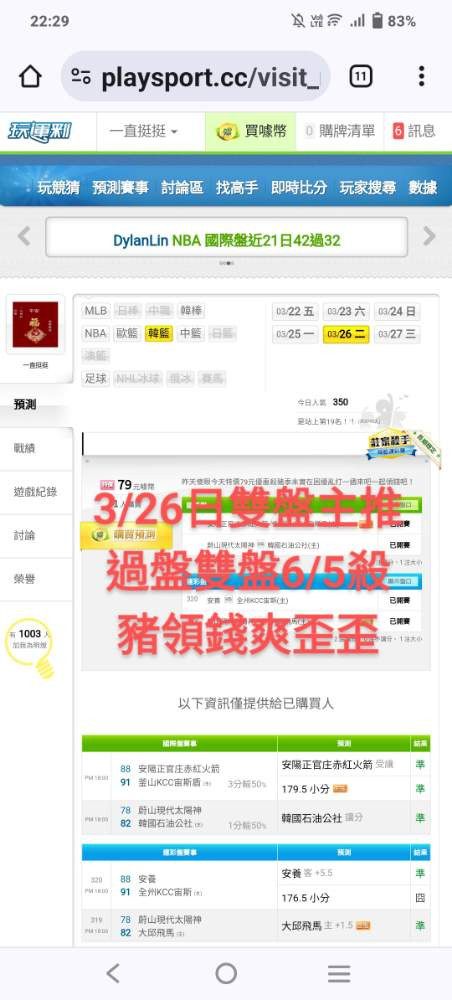 韓國職籃 >> 國際連贏2天7過6今天一場比賽小叮嚀有詳細說明邀請朋友們上車繼續殺豬領錢!