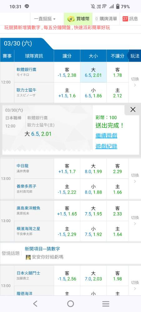 日本職棒 >> 3/29日國際盤4過3今天12點比賽邀請朋友們上車一起殺豬頭領錢爽歪歪!