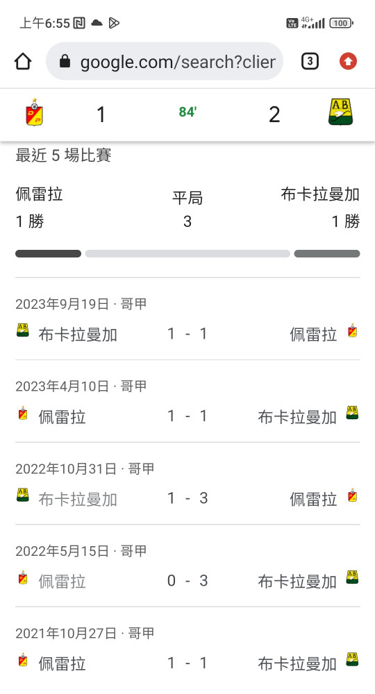 數據是可以參考的,雙方最近5場對戰,布卡拉曼競技至少得到1分,今天一樣延續這個記錄。過關,開心~