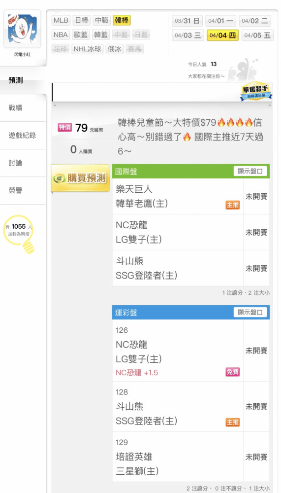 韓國職棒 >> 韓棒🔥出擊🔥國際主推近7天過6🔥雙盤信心高🔥連假第一天大特價$79~$79~