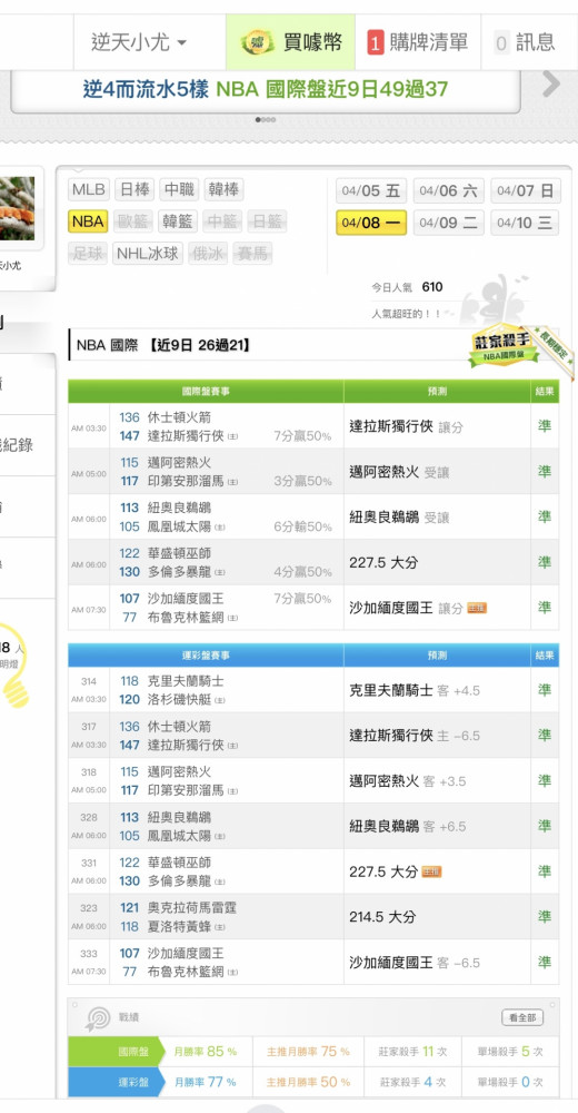 NBA >> 近9日26過21(81%) 前天雙盤12過12,明天小叮嚀推薦五場比賽!