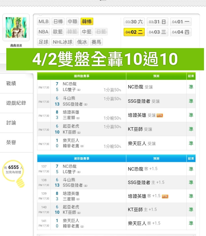 韓國職棒 >> ⭐韓棒 【運彩讓分連贏5天14過13】信心主推99%貓場10倍注,一注幫你翻綠~⭐