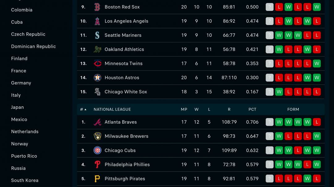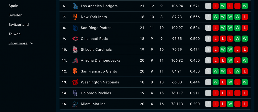 國家聯盟:一勇士•二釀酒人•三小熊•四費城人•五海盜•六道奇•七大都會•八教士•九紅人•十紅雀•十一響尾蛇•十二巨人•十三國民•十四落磯山•十五馬林魚