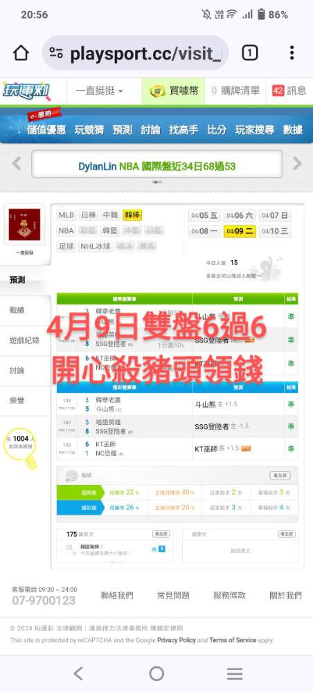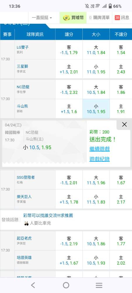 韓國職棒 >> 4月23日雙盤7過7運彩讓分近9日19過15正夯朋友們上車殺豬領錢爽歪歪!