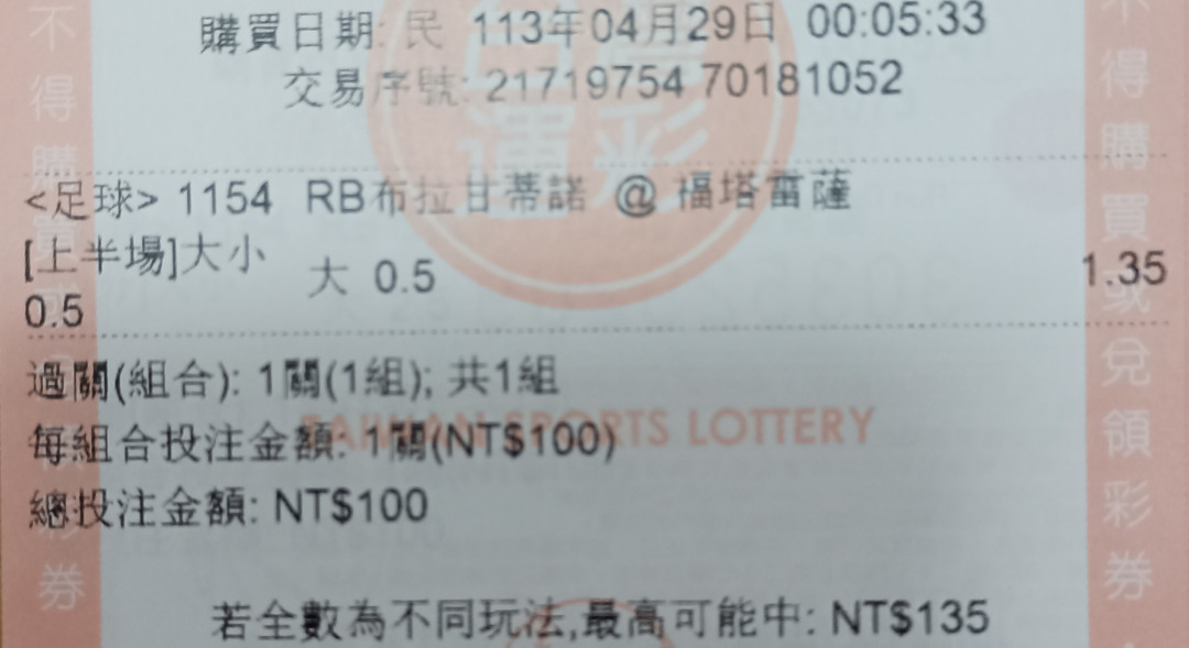 >> 巴甲 05:30單場 上半場大於0.5