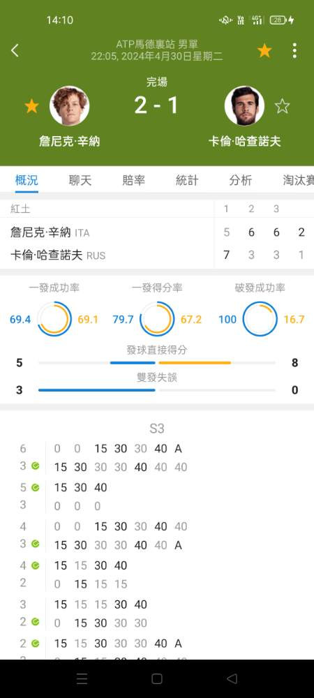 我昨天後來看365說的沒錯,辛納 第三盤 6:3