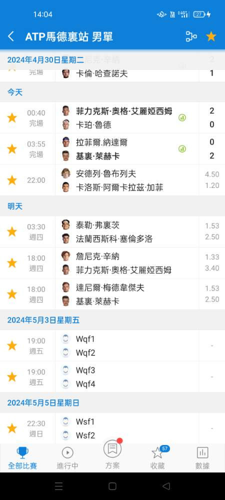 有呀,目前串所有類型的球賽,昨天我網球方向有看對,辛納勝出 這場跟斯威雅蒂的劇本一樣 讓1追2,我是後來倒加菲貓,硬要打到搶7 梅總倒1次 -3.5過讓硬打3分卡洞加菲貓倒1次 -3.5過讓 硬打3分卡洞