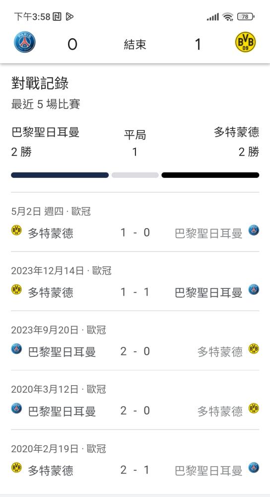 數據是可以參考的,雙方最近5場對戰,巴聖日耳曼最多2分,今天一樣延續這個記錄。過關,開心~