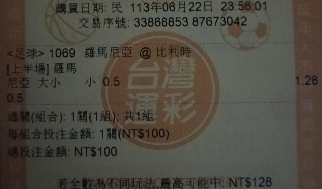 >> 歐國盃 羅馬尼亞 上半場小於0.5(6/23)