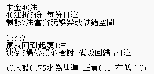 你不要再丟本金進來了 用剩下的玩就好 目前先不要想凹回水上(這個放在以後再思考) 首要任務是要把剩餘本金玩到健康水位 也就是均注跟本金要1:100 玩這個才不會有壓力 你也不會連倒就想要凹 然後均住跟每場注數控制  ...恕刪