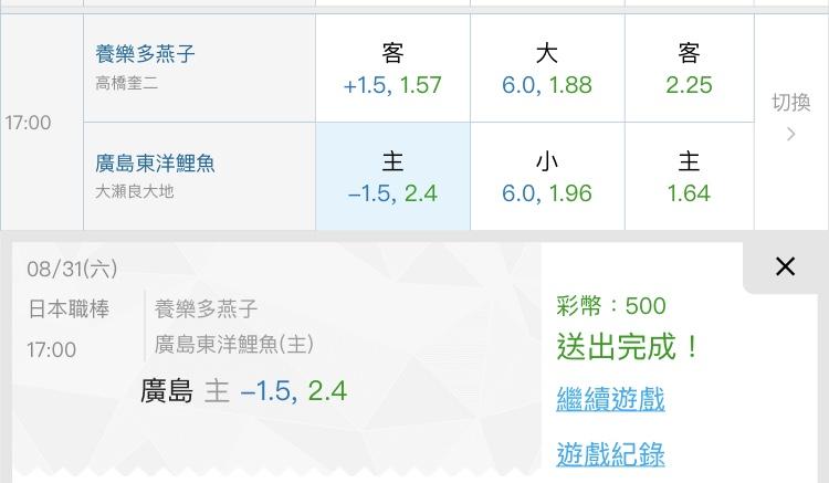 簡單推薦 : 廣島東洋鯉魚 1+50、運彩可下廣島PK、多多小於2.5