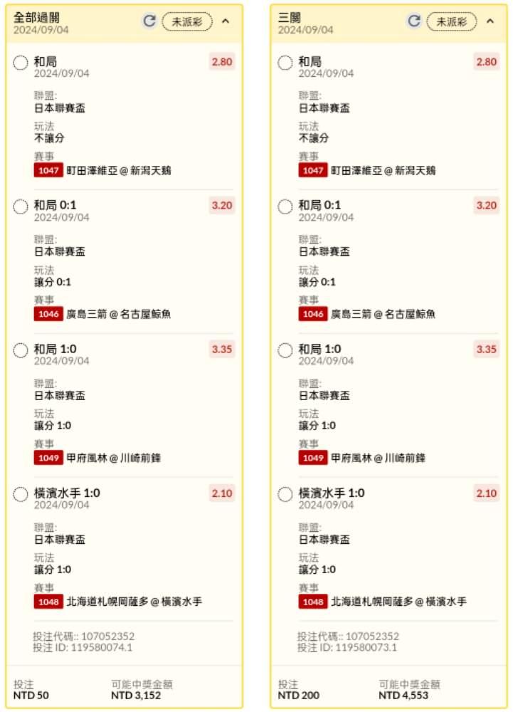 足球 >> 晚場日聯盃讓分串關分享4單試單(不同讓分組合)