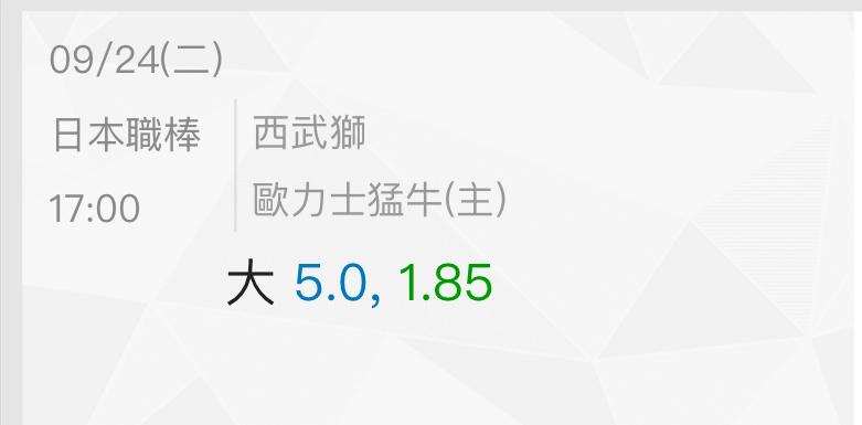 西武歐力士全場大 今天唯一的一場日職 今井先發對戰歐力士洋將 西武的打擊加上兩個投手都不爛的情況 開4.5還蠻合理的 但就是小分太合理所以我反著抓 大分很硬