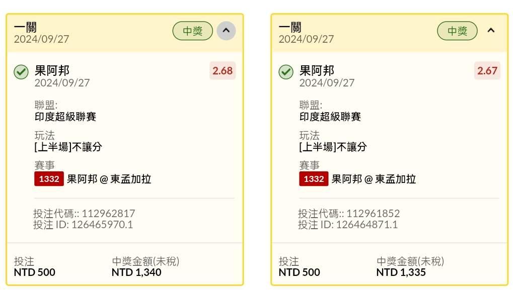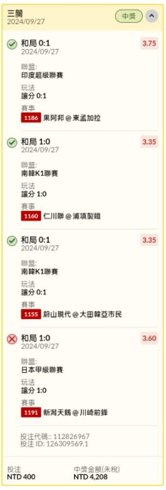 過關炫耀 >> 足球晚場讓分串關4過3中42倍加場中