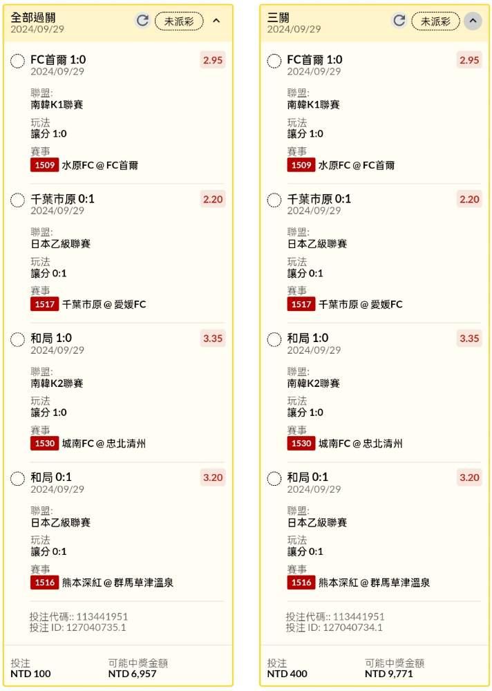 足球 >> 下午日韓場2單讓分串關分享(4場賽事)