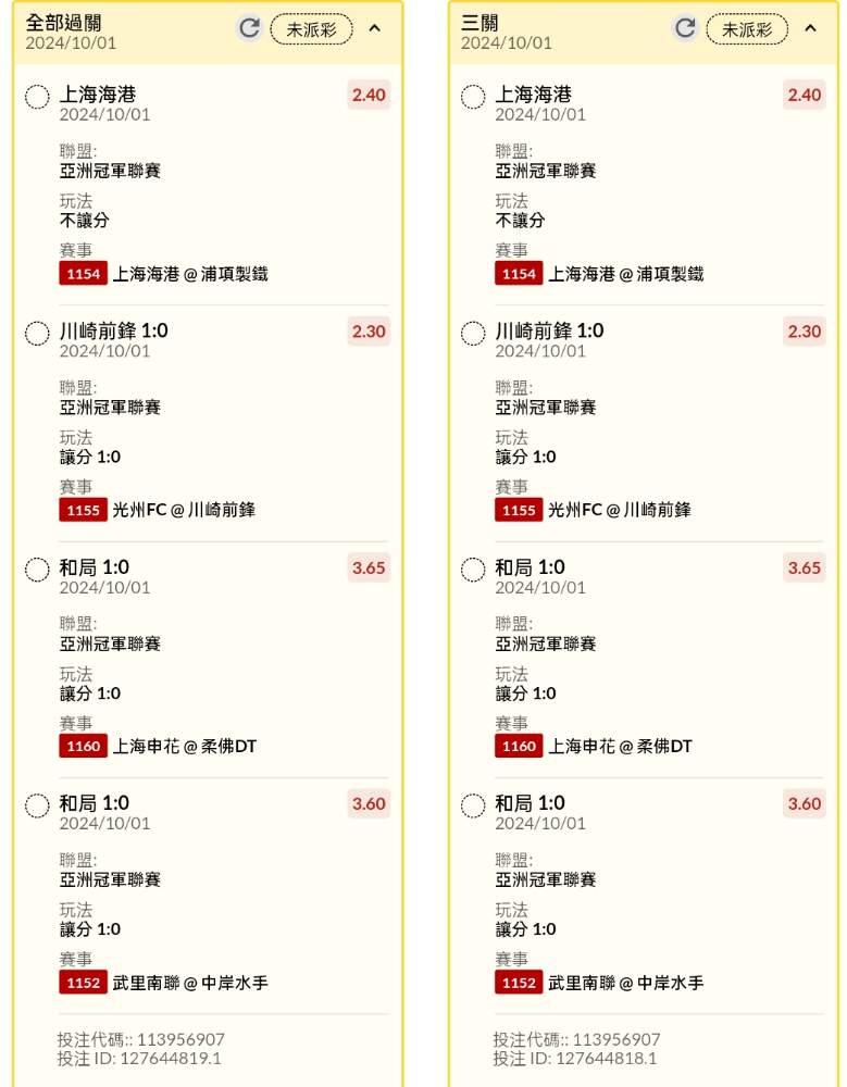 >> 亞冠賽讓分串關分享2單(4場賽事)