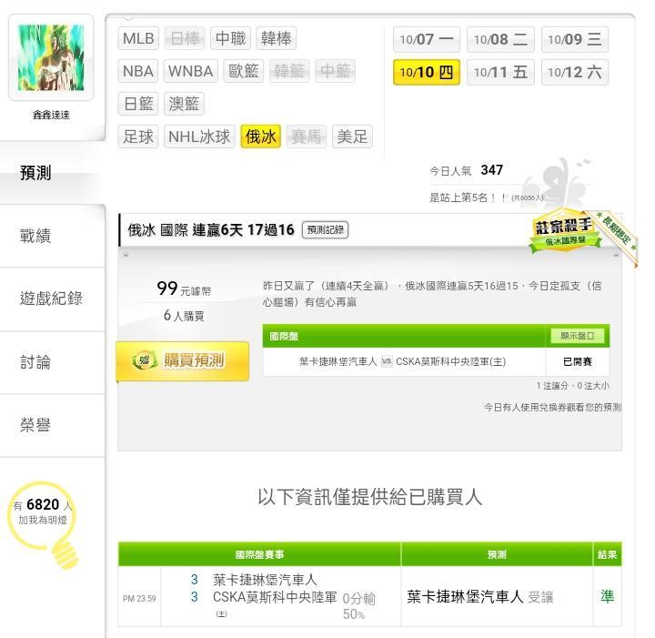 俄羅斯冰球 >> ⭐[本週勝率第一名,10勝0敗勝率100%]連贏7天18過17,今日定孤支(信心貓場)⭐