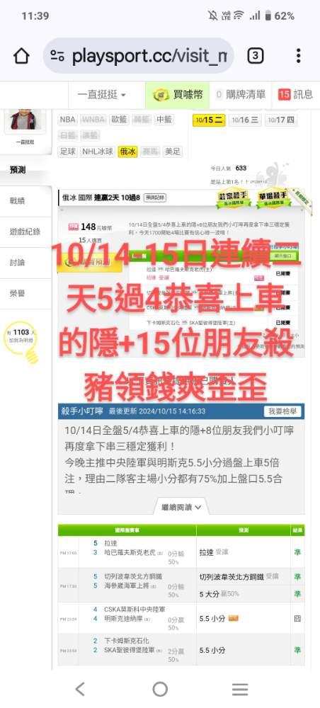 俄羅斯冰球 >> 10/14-15日連贏二天10過8恭喜上車的隱+15位朋友們一起殺豬爽歪歪!