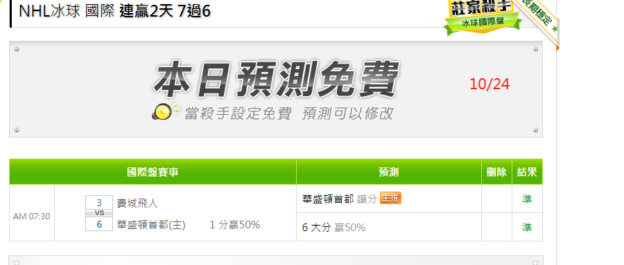 NHL冰球 >> 10/26 NHL分享【今日5過4】【近2日7過6】特價