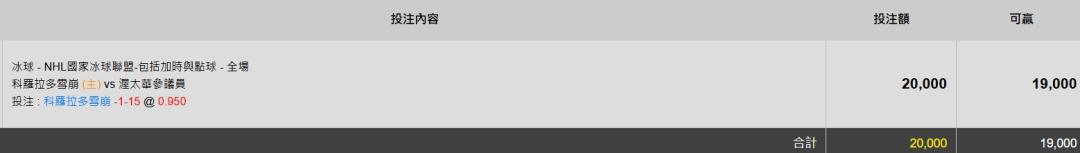 投注 : 科羅拉多雪崩 -1-15 @ 0.950