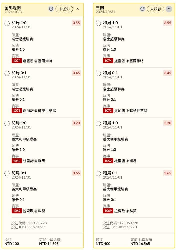>> 颱風夜足球讓分串關分享2單(6場賽事)