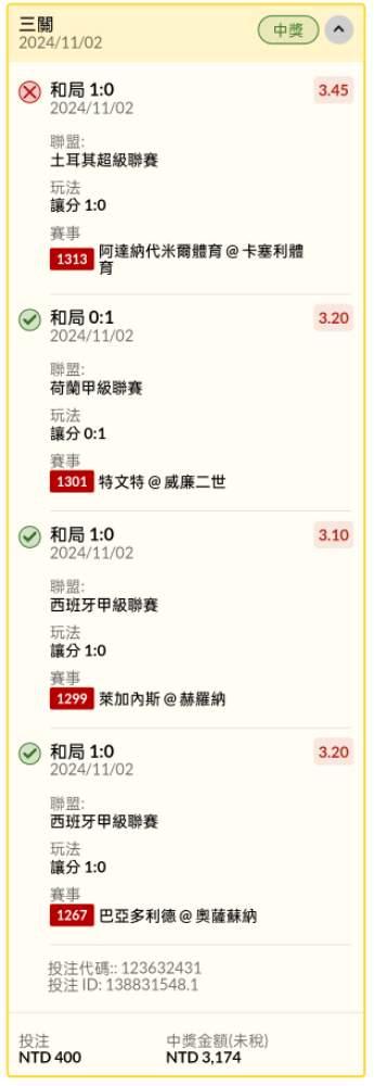 過關炫耀 >> 足球晚場讓分串關4過3中31倍