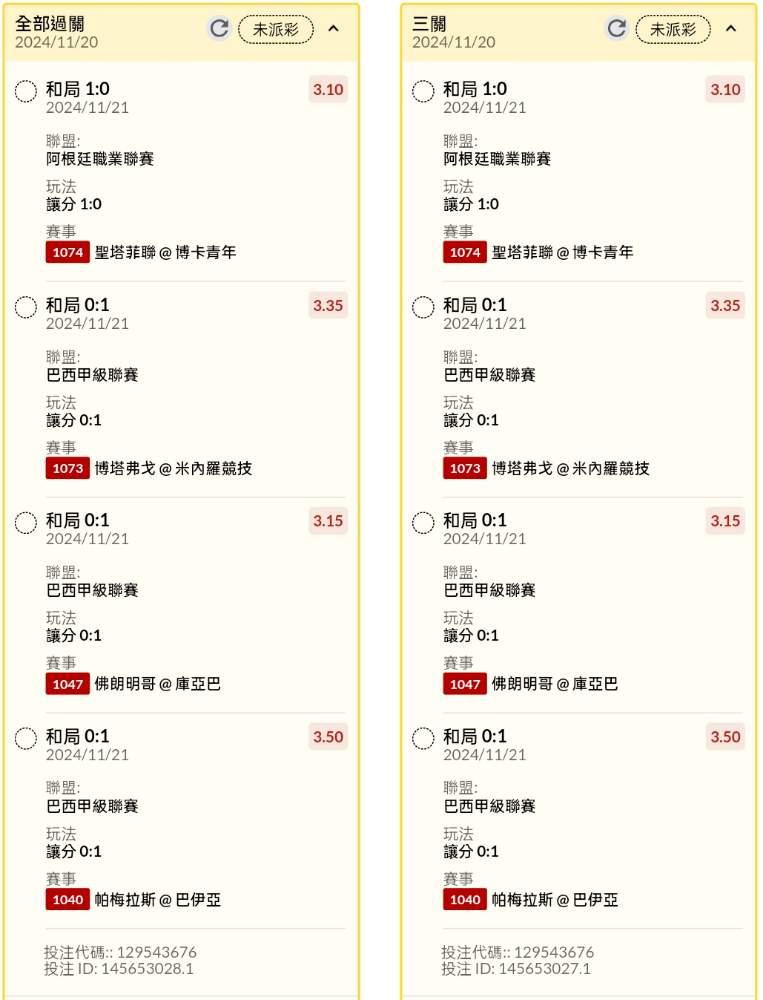 >> 清晨早場讓分串關分享2單試單(4場賽事)