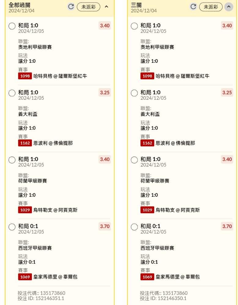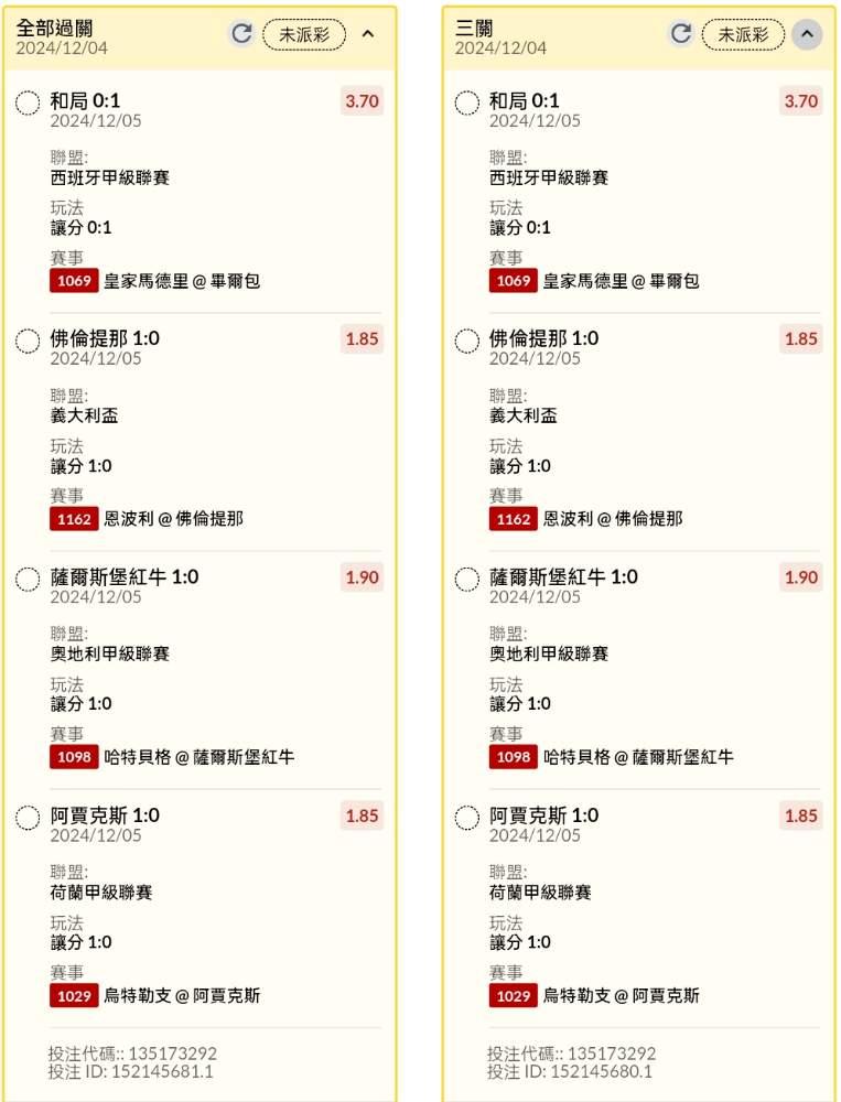 >> 半夜早場讓分串關分享小玩4單(8場賽事不同組合)