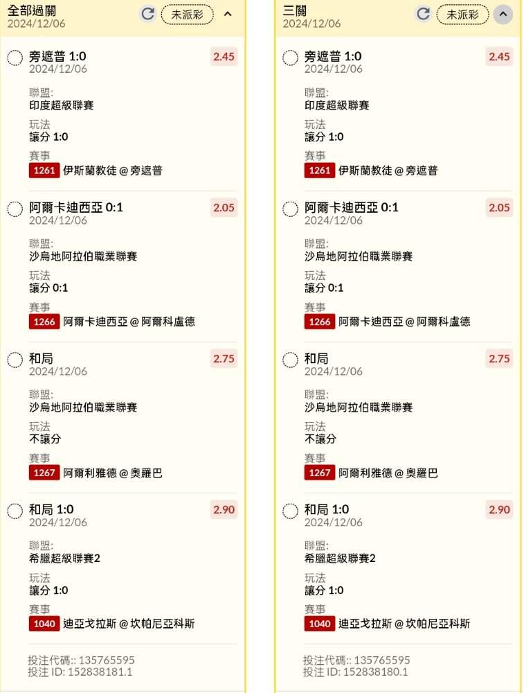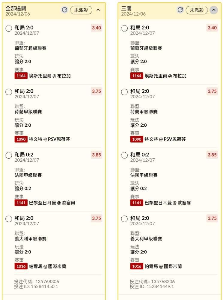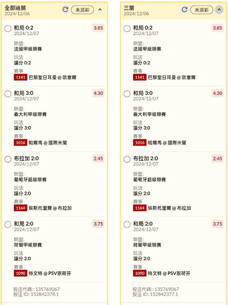 足球 >> 晚場半夜讓分串關分享4單(8場賽事讓分不同組合)