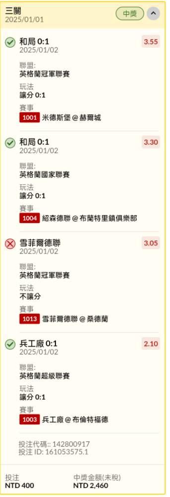 過關炫耀 >> 足球半夜場讓分串關4過3