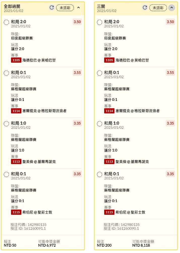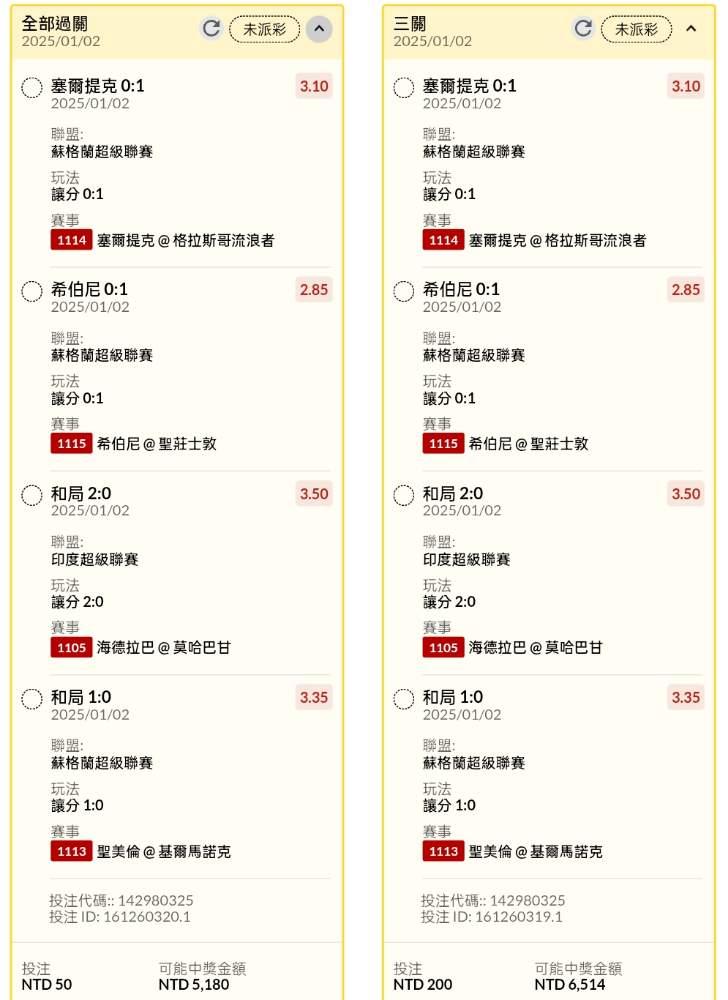 足球 >> 晚場讓分串關分享2單(4場賽事不同讓分組合)