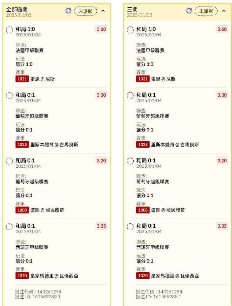 足球 >> 半夜場讓分串關分享2單試單(4場賽事)