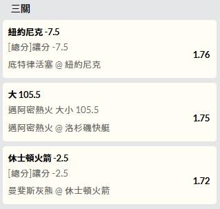 3.火箭 讓2.5 賠率1.72 三串一抓個感覺,希望明天不要倒打 哈哈