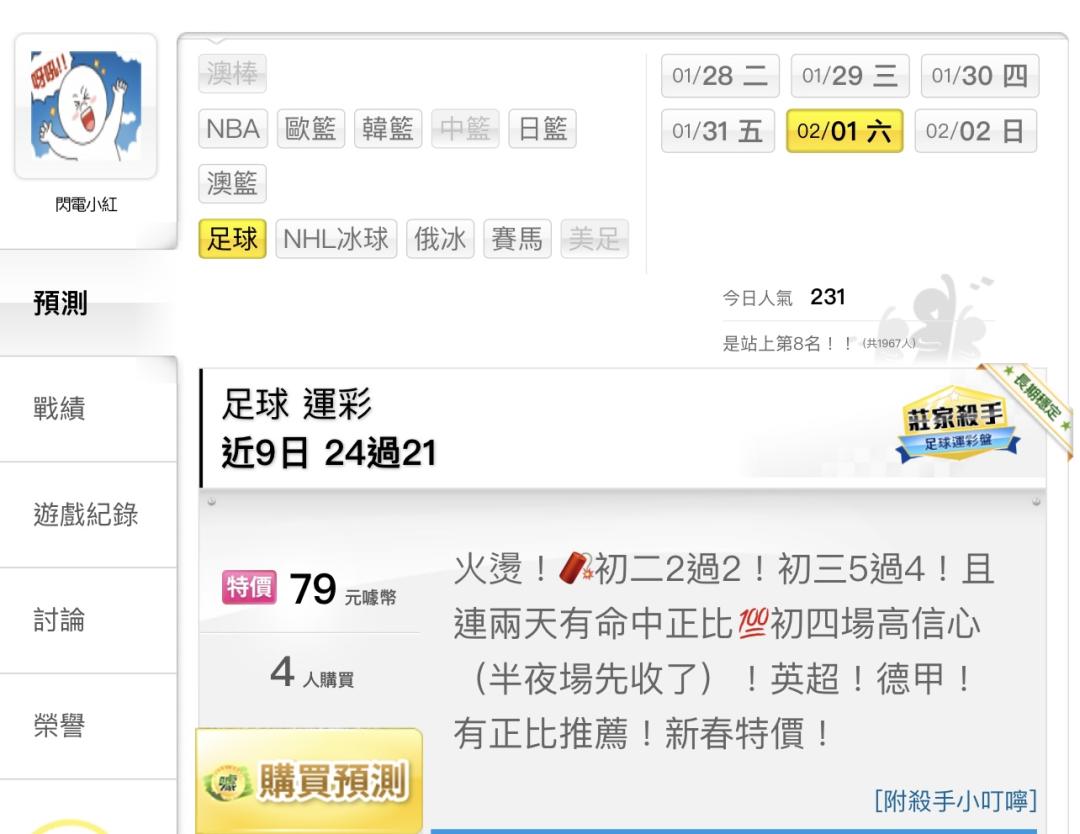足球 >> ⚽️近9天24過21🧨初二三連兩天有命中正比4場過3場🔥初四高信心新春$79!有正比推薦🧨