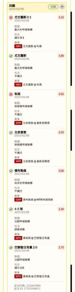 >> 足球半夜單 成功過三過四