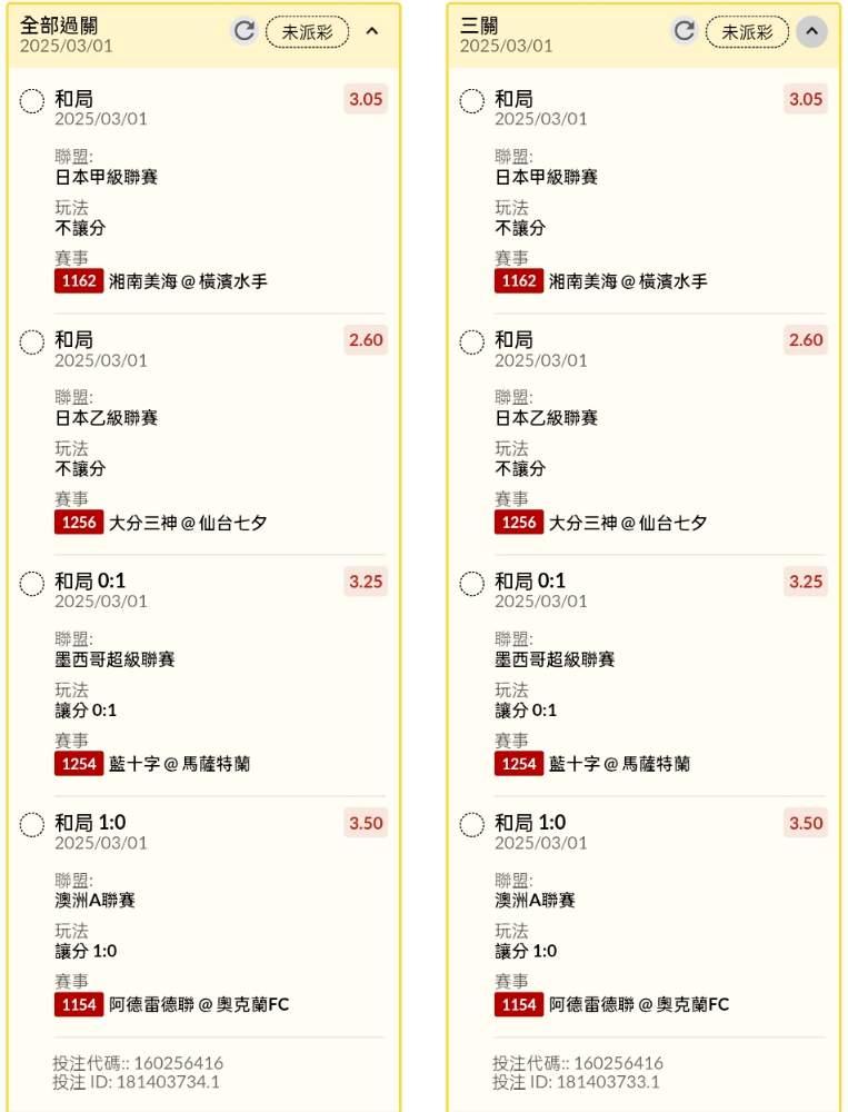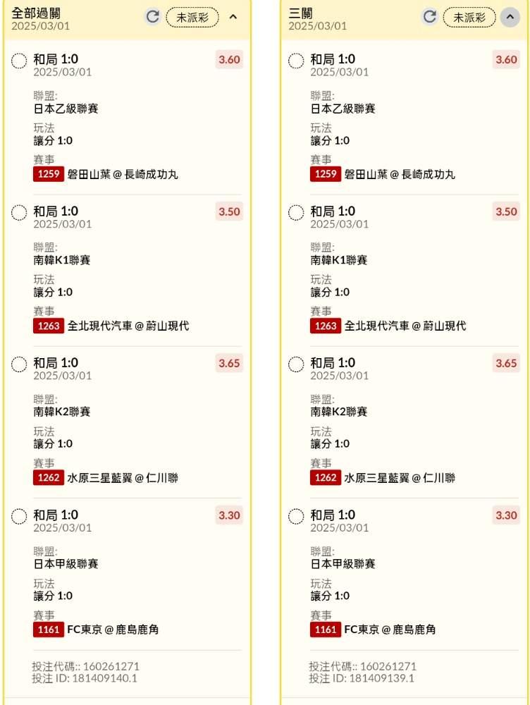 >> 日韓場讓分、和局串關小玩6單分享(12場賽事不同讓分、和局組合)