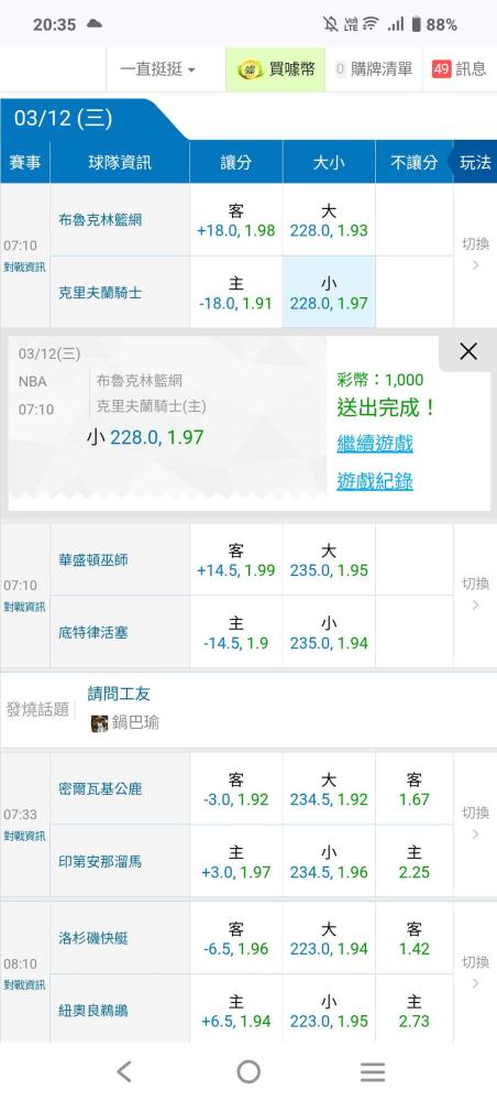 NBA >> 3/12雙主推輸贏三注串三殺豬喜歡79元特價跟上!