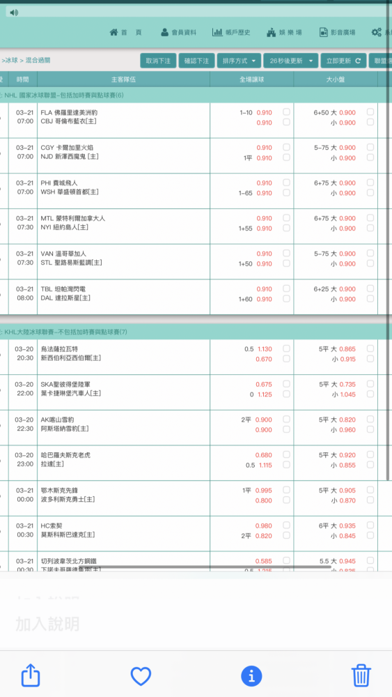 >> 3/21 NHL 冰球 初盤