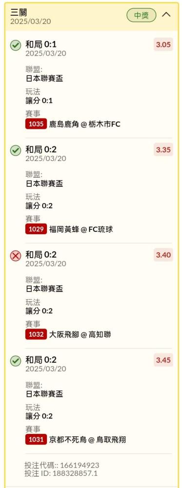 過關炫耀 >> 日聯賽讓分4過3過1單