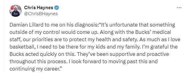 利拉德對名記Hayes談及自己的診斷結果:“很不幸,出現了這種我無法控制的狀況。和公鹿隊的醫療團隊一樣,我們的首要任務是保障我的健康與安全。儘管我無比熱愛籃球,但我也得為孩子們和家人著想。我很感激公鹿隊迅速採取行動,在整個過程中,他們始終給予支持,積極應對。我期待順利渡過這一難關,繼續我的職業生涯。”醫生Evan Jeffries在個人推特上表示,利拉德正在服用血液稀釋劑,通常至少要服用3個月,他很可能會像文班亞馬一樣缺席本賽季剩餘比賽。